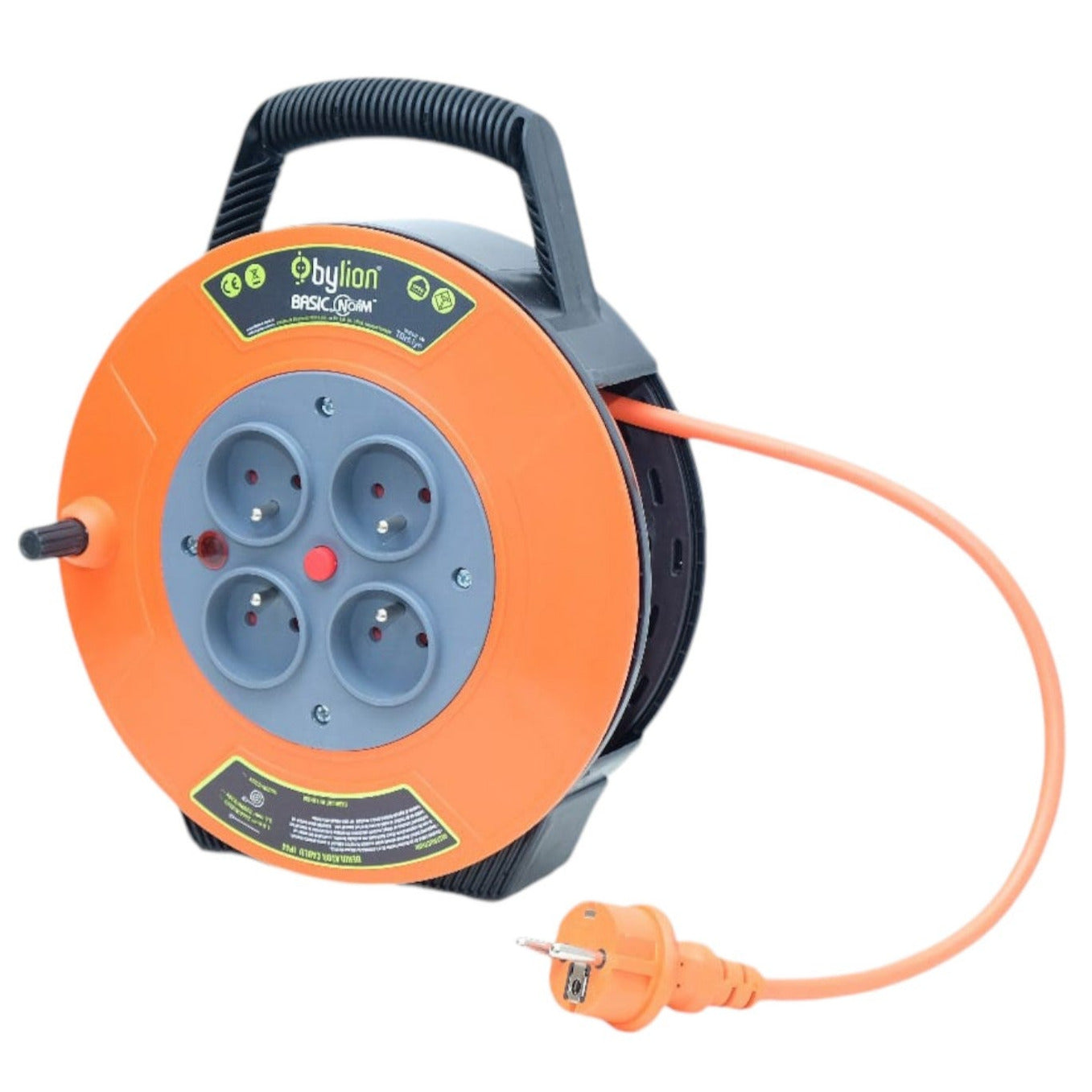 Compact retractable extension cable reel/cable drum, 10 m cable with 4 sockets IP20 + thermal fuse