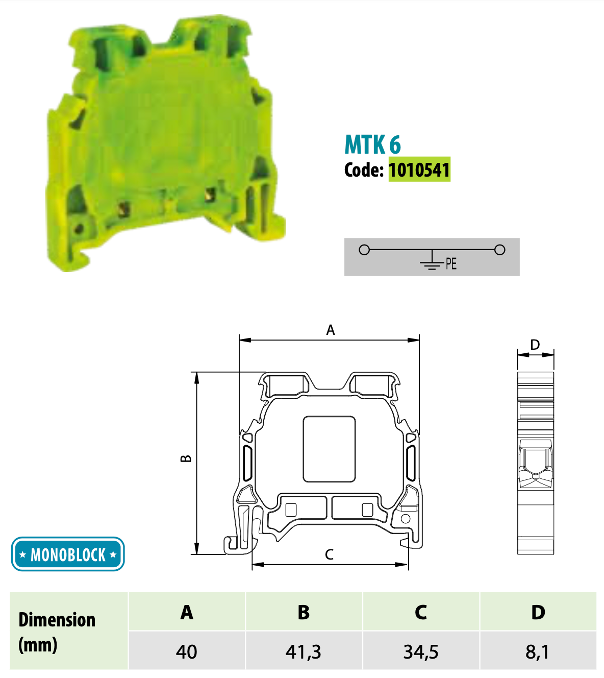 PE threaded rail connector / DIN rail terminal block 2-wire green-yellow, ONKA, made in Turkey