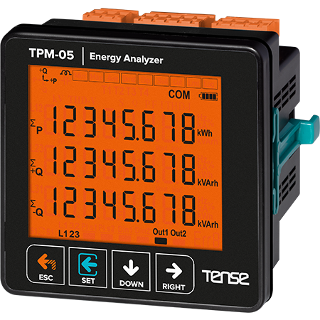 3-fas nätverksparameteranalysator - trefas multifunktionell digital panelmätare, ström, spänning, frekvens och total effektindikator, med två reläutgångar och digital ingång, RS485 ModBus RTU - TPM-05 tillverkare TENSE (Turkiet) panelmätare.