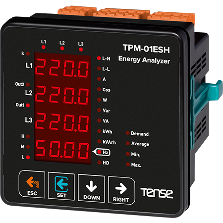3-fas nätverksanalysator / Nätverksanalysator / Nätverksparametermätare - Multifunktionell digital panelmätare, ström, spänning, frekvens och total effektindikator, med två reläutgångar och digital ingång, RS485 ModBus RTU - TPM-01ESH tillverkare TENSE (Turkiet)