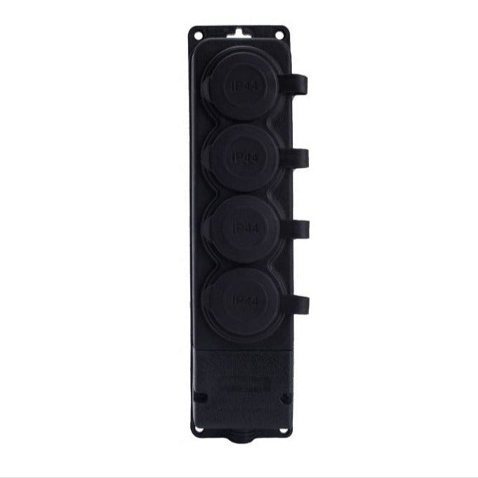 Svart kvalitetsuttag 4 x "gummi" hermetiskt quad med IP44-skydd(med klaff) med SCHUKO-jordningsstandard, 16 ampere 250 volt, tillverkare Bylion